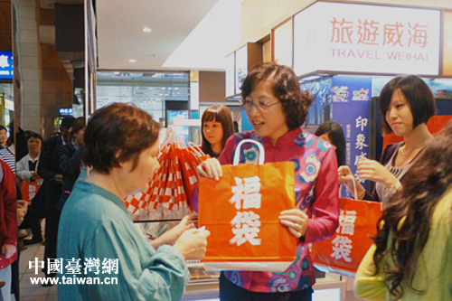 威海市委副書記、市長張惠在威海旅游(臺北)服務中心發放福袋。(圖片來源:威海市臺辦)