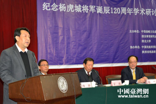 中國(guó)臺(tái)灣網(wǎng)11月28日西安消息 日前,西安事變研究會(huì)、中國(guó)戰(zhàn)略文化研究會(huì)、西北大學(xué)等聯(lián)合主辦了紀(jì)念楊虎城將軍誕辰120周年學(xué)術(shù)研討會(huì)。楊虎城將軍的女兒楊振美、次孫楊瀚和來(lái)自海峽兩岸各界專(zhuān)家學(xué)者出席研討會(huì)。陜西省臺(tái)辦副巡視員陳一峰參加會(huì)議并致辭。