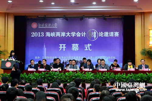 中國臺灣網12月9日南昌消息 日前,2013海峽兩岸大學會計辯論邀請賽開幕式在江西財經大學蛟橋園舉行。江西財經大學副校長鄧輝致歡迎辭,臺灣會計研究發展基金會委員謝國松、臺灣大學教授陳國泰、中南財經政法大學教授湯湘希、臺灣參賽選手代表游佳璇先后發言。