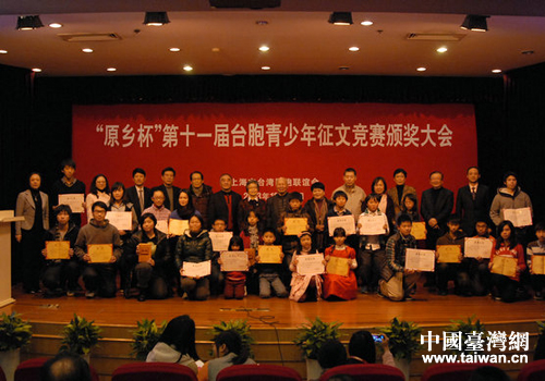 中國臺灣網12月23日上海消息 12月22日下午,“原鄉杯”第十一屆臺胞青少年征文競賽頒獎大會在文新報業大廈舉行。中共上海市委統戰部秘書長李群策、市政協港澳臺僑委員會專職副主任沙怡、市臺辦副主任瞿國樑、市臺聯會長盧麗安和原市政協副主席鄭勵志、石四箴等領導出席并頒獎。獲獎學生及老師、家長、各界來賓200余人與會。