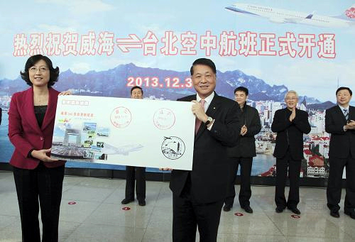 儀式結(jié)束后,張惠市長、孫洪祥董事長共同為“威海—臺北空中航班”首航紀(jì)念封簽章(視頻鏈接:http://v.whnews.cn/html/shizheng/2013_12/671.html)。