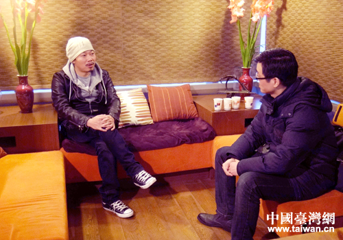 江西籍臺灣著名作詞人方文山(左)接受記者采訪。(圖片來源:江西省臺辦)