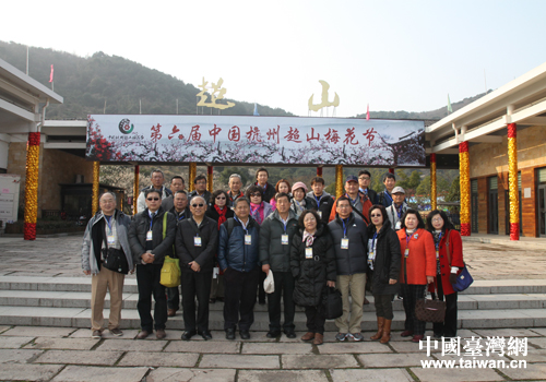 參訪團一行參觀第六屆中國杭州超山梅花節合影留念。(圖片來源:杭州市臺辦)