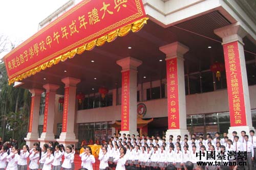 3月28日,東莞臺商子弟學(xué)校舉辦甲午年成年禮大典。典禮過程依據(jù)古代周禮中士冠禮、士相見禮與相飲酒禮之精神而設(shè)。在經(jīng)過佩冠禮等儀式后,共有190名臺商子弟授冠成年。此次成年禮活動除傳承中華文化古禮,讓學(xué)生意識到成年負(fù)責(zé)的過程之外,更不斷創(chuàng)新,融入感恩教育與生活教育,對于海峽兩岸(粵臺)中等教育論壇主題來說同樣是一個最好的范例。(中國臺灣網(wǎng)、東莞市臺辦聯(lián)合報道)