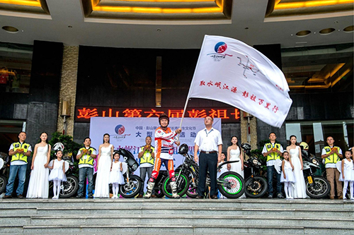 中國臺灣網(wǎng)四川眉山訊 近日,四川省眉山市彭山區(qū)舉行了“彭祖文化走四方取水岷江源”出征儀式,宣告為期8天的“彭祖文化走四方取水岷江源”活動(dòng)正式開始。祖籍彭山區(qū)青龍鎮(zhèn)的臺灣“亞洲車神”陳雙全在開幕儀式上表演了飛車特技。彭山區(qū)委書記梁磊為陳雙全及隊(duì)員授隊(duì)旗。