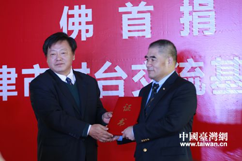 中國臺灣網12月30日天津訊 12月30日上午,佛首捐贈暨天津市對臺交流基地授牌儀式在天津市武清區博物館舉行。中國國民黨中央評議委員會主席團主席張榮恭,中國國民黨中央評議委員李建榮、葉景成,佛首捐贈人、臺商吳尚鷹等臺灣嘉賓出席此次活動。