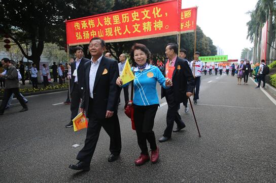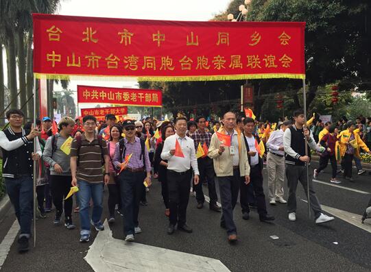 中山市臺務局局長林慶和(前排右一)、中山市臺聯會長肖德源(前排右二)、臺北市中山同鄉會常務監事楊憲超(前排右三)率領臺北市中山同鄉會、中山市臺灣同胞臺胞親屬聯誼會聯合主隊行進在慈善萬人行巡游隊伍中。