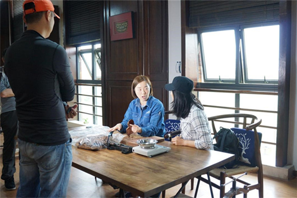“132”秘制雪茄小組嫡傳弟子李秋月(中)現(xiàn)場演示雪茄卷制