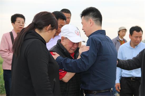 4月21日上午,金貴發(fā)老人攜妻兒在家鄉(xiāng)親屬的陪同下分別來到父母和兄弟墳前祭祖,金貴發(fā)終將數(shù)十年思緒宣泄,泣不成聲。在母親的墳頭,他含著淚水,深情地表白道:回家的路太漫長了,明年我還會(huì)回來,為您立碑。
