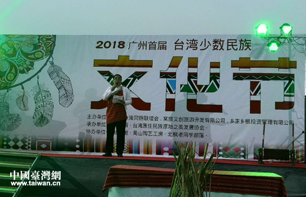 中國(guó)臺(tái)灣網(wǎng)5月8日廣州訊 日前,由廣州市臺(tái)灣同胞聯(lián)誼會(huì)、窩旅文創(chuàng)旅游開(kāi)發(fā)有限公司、鄉(xiāng)土鄉(xiāng)根投資管理有限公司聯(lián)合主辦的 “廣州首屆臺(tái)灣少數(shù)民族文化節(jié)”在廣州市番禺區(qū)開(kāi)幕。臺(tái)灣立法機(jī)構(gòu)民意代表、臺(tái)灣原住民族生存發(fā)展協(xié)會(huì)理事長(zhǎng)孔文吉專(zhuān)程從臺(tái)灣飛赴廣州參加開(kāi)幕式,廣州市臺(tái)聯(lián)會(huì)長(zhǎng)葉耀華、臺(tái)灣原住民族從業(yè)者代表、臺(tái)灣嘉賓、在穗臺(tái)商代表以及省、市、番禺區(qū)臺(tái)辦有關(guān)負(fù)責(zé)人共100余人參加了開(kāi)幕式。