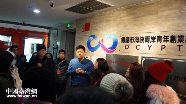 許淵順(中)為到訪德陽青創(chuàng)園的臺(tái)灣同胞介紹園區(qū)發(fā)展情況。(圖片來源:四川省臺(tái)辦)