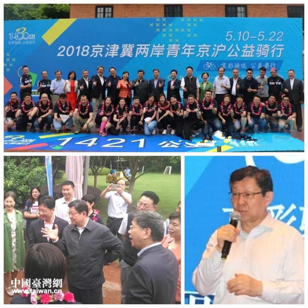 中國臺灣網5月25日上海訊 5月22日上午,“京彩騎跡·公益前行”——2018京津冀兩岸青年京滬公益騎行活動在上海世博園圓滿收官。原海協會會長陳德銘、上海市臺辦主任李文輝、北京市臺辦副主任于鳳英、上海市臺辦副巡視員李偉、上海市臺協會長李政宏、北京市臺協會長章啟正等出席儀式。