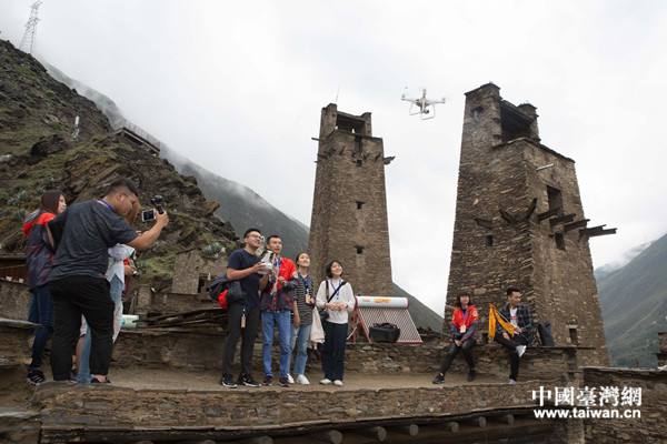 “最炫藏羌風——第二屆臺灣傳媒大學生實習交流暨航拍體驗活動”走進羌族建筑群落典型代表——桃坪羌寨。(圖片來源:四川省臺辦)