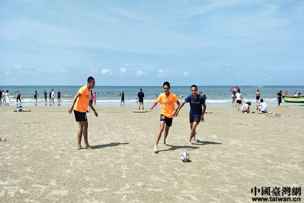 同學們在北海銀灘上踢“沙灘足球”(圖片來源:北海市臺辦)