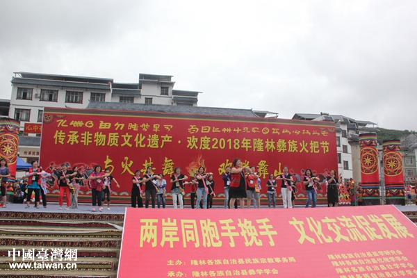 5日下午,參訪團(tuán)一行參加隆林彝族火把節(jié)文藝聯(lián)歡及民俗表演活動。以“兩岸同胞手拉手、文化交流促發(fā)展”為主題的文藝演出在歡快的彝族歌舞《俄迷吉奪咧》中拉開序幕,以富有隆林民族特色的節(jié)目,向臺灣同胞展現(xiàn)了隆林特有的民族風(fēng)情。臺灣同胞帶來的歌舞《我們都是一家人》節(jié)目,將文藝演出推向了高潮,不一樣的舞姿,不同的音樂,洋溢著同一種歡樂。臺灣同胞還參與到充滿彝族特色的打磨秋、搶鴨蛋、搶姑娘、抹黑臉等民俗表演活動中,體驗彝族火把節(jié)的濃厚趣味。在德峨鎮(zhèn),參訪團(tuán)還到居民家中與居民面對面交流,當(dāng)?shù)鼐用衲贸鲎葬劦臈蠲肪频扰c臺灣朋友共享,賓主盡歡認(rèn)兄弟。不少團(tuán)同表示,來到這里就像到兄弟的家,希望下次有機(jī)會再來參加火把節(jié),再拜訪自己的兄弟。