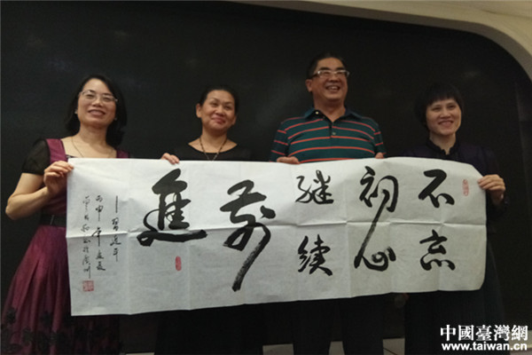 中華婦女聯合會理事長何建華(左二)向市臺聯贈送墨寶。(圖片來源:廣州市臺聯)