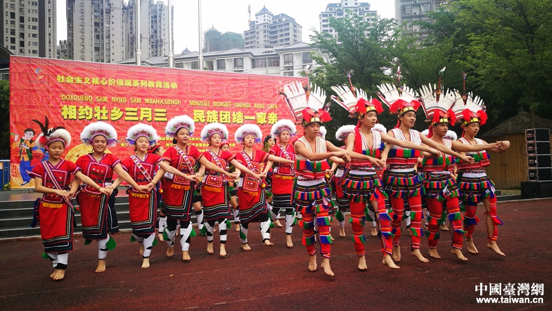 花蓮縣化仁中學學生在南寧市桂雅路小學“三月三”歡慶活動上表演民族歌舞。(圖片來源:廣西南寧市臺辦)