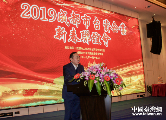 中國臺灣網1月18日成都訊 2019年1月16日,2019成都市臺資企業新春聯誼會舉行。省市有關部門負責人與在蓉臺商共計550余人歡聚一堂,喜迎新春。四川省臺辦主任羅治平、成都市委常委吳凱、成都市臺協會長徐大偉出席并致辭,成都市臺辦主任戴浚主持聯誼會。