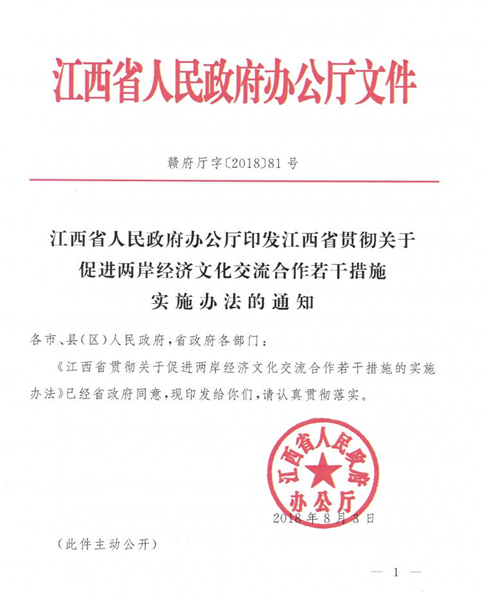 2、江西省臺辦積極推動“惠臺31條”落地生效。于8月8日正式發布《江西省貫徹關于促進兩岸經濟文化交流合作若干措施的實施辦法》(簡稱“江西惠臺60條”)。