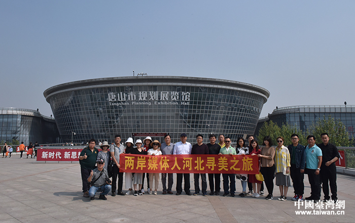 “尋美之旅——兩岸媒體河北巡禮”新聞交流活動日前舉辦。兩岸媒體人在唐山市規劃展覽館前合影。(來源:河北省臺辦)