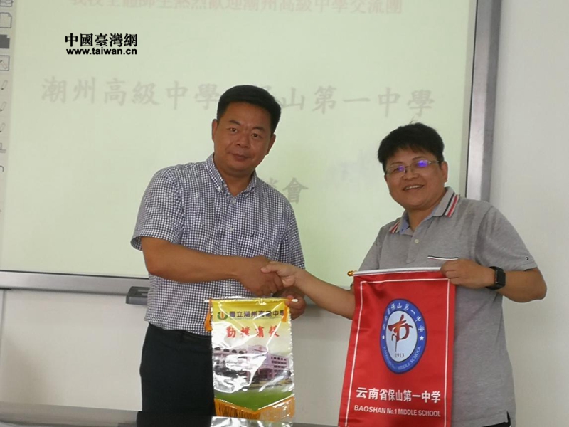 保山第一中學(xué)校長(zhǎng)陳圣日和臺(tái)灣潮州高級(jí)中學(xué)交流團(tuán)團(tuán)長(zhǎng)蔡季延互贈(zèng)校旗。(圖片來源:云南省臺(tái)辦)