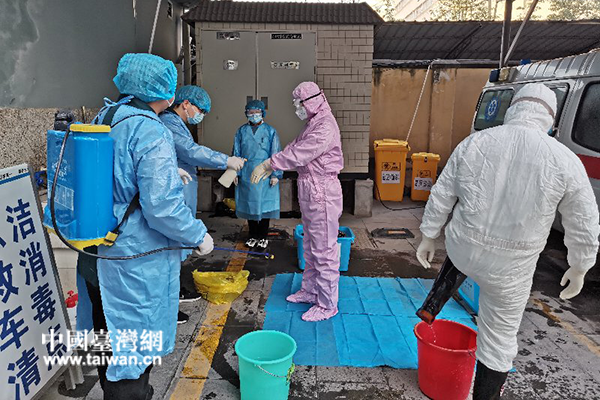 陶怡秀(左三)培訓醫護人員用負壓救護車接回新冠病人后的消毒工作。(圖片來源:陜西省臺聯)
