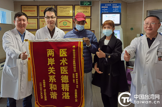 中國臺灣網12月21日訊 12月10日上午,臺商潘先生的妻子范女士將一面寫有“醫術醫德精湛 兩岸關系和諧”的錦旗送到了四川攀枝花市中心醫院神經疾病中心,對該中心醫護人員一個多月以來對潘先生的精心治療和細心照護表示感謝。