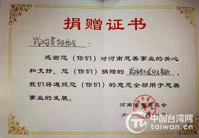 截至目前,武漢臺資企業協會將已收到的捐款合計人民幣23.2萬元,匯至河南省慈善總會“防汛抗洪馳援河南”慈善項目接收捐款專戶。河南省慈善總會發來捐贈證書,表示感謝。