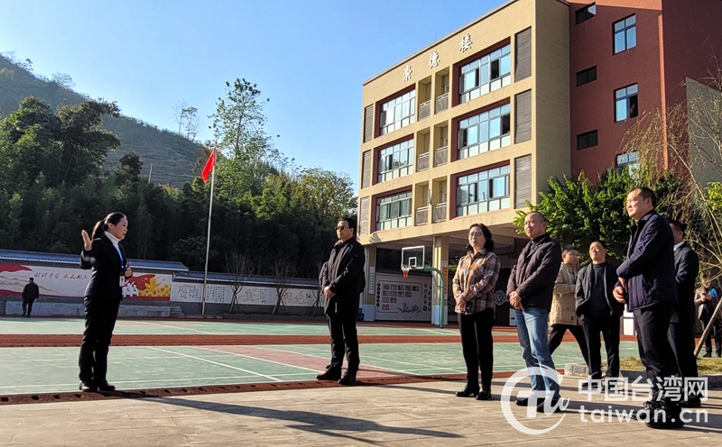 張軍(左二)調研臺胞援建宜賓市珙縣周村小學(圖片來源:四川省臺辦)
