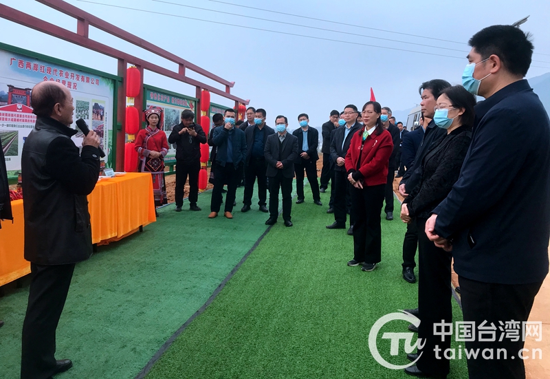 莊久毅(左一)向富川縣有關(guān)領(lǐng)導(dǎo)介紹企業(yè)發(fā)展情況(圖片來(lái)源:廣西賀州市臺(tái)辦)