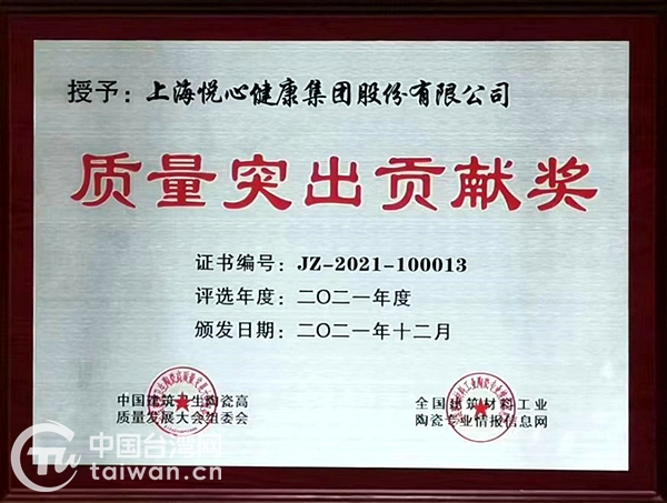 中國臺灣網10月9日訊 臺資企業悅心健康集團近日發布喜報,子公司斯米克(全稱“上海斯米克建筑陶瓷有限公司”)榮獲2021年度“質量突出貢獻獎”。