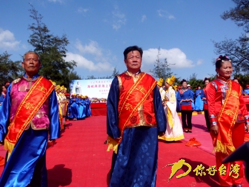 湄洲媽祖祖廟董事會董事長林金榜等三位主祭人率兩岸信眾,面朝大海,向媽祖神像行三跪九叩大禮。