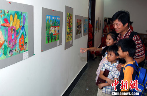 10月9日,來自臺灣的小朋友正在和老師一起看畫展。當日,來自臺灣及福州的小朋友們在福州畫院舉辦“親情海峽 彩虹書畫――第二屆榕臺小學生書畫交流會”。兩岸小朋友都很高興以書畫為平臺,更好的交流。