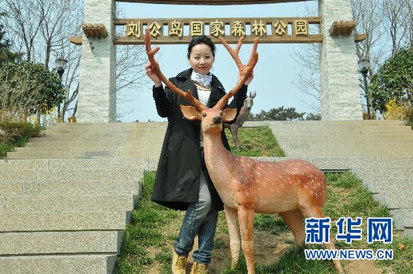 4月14日,一位媒體記者在劉公島國(guó)家森林公園門前與梅花鹿雕塑合影。 臺(tái)灣梅花鹿“繁星”“點(diǎn)點(diǎn)”和長(zhǎng)鬃山羊“喜羊羊”“樂(lè)羊羊”將于4月16日正式入住威海劉公島國(guó)家森林公園。 新華社記者 鄧衛(wèi)華 攝