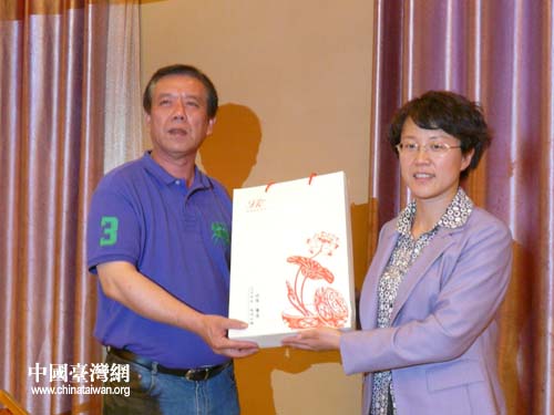 棗莊市委副秘書長(zhǎng)、臺(tái)辦主任畢志偉(右)向陳文科贈(zèng)送禮品。(圖片來(lái)源:棗莊臺(tái)辦)