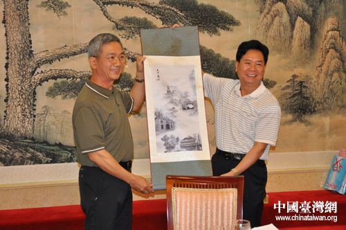 廣東省臺辦副主任蔣長芳與臺中市南區里長聯誼會榮譽團長李印欽互贈紀念品。(圖片來源:清遠市臺辦)
