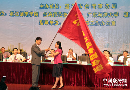 湛江市委常委、宣傳部長(zhǎng)盧瑜(右)向夏令營(yíng)總領(lǐng)隊(duì)授旗。(圖片來(lái)源:湛江臺(tái)辦)