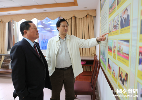 梅州市委臺辦主任、梅州市海峽兩岸交流基地辦公室主任吳壽康(右)向苗栗縣縣長劉政鴻介紹梅州市海峽兩岸交流基地的情況。(圖片來源:梅州市委臺辦)