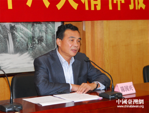 廣東省臺辦主任陳國興主持會議并傳達(dá)黨的十八大精神。(圖片來源:廣東省臺辦)