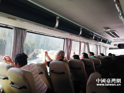團(tuán)員們在車上沿途拍攝果子溝大橋。(中國臺(tái)灣網(wǎng) 馬一娜 攝)