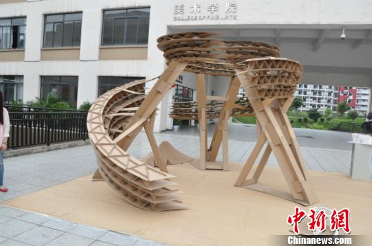 “這件作品的靈感來自于我在臺灣的所見所聞,是模仿臺灣設計師擅長的瓦楞紙創作做的造型,當你走進這個建筑中間,陽光透過層層玻璃反射出的三角幾何狀的斑斑點點就會灑在你的身上,每個時辰都有不同的光,不同的形狀,會有一種夢幻般的感覺。”廣西藝術學院建筑藝術學院2015屆畢業生姚琳璇指著自己創作的作品《時光剪影》對記者說。