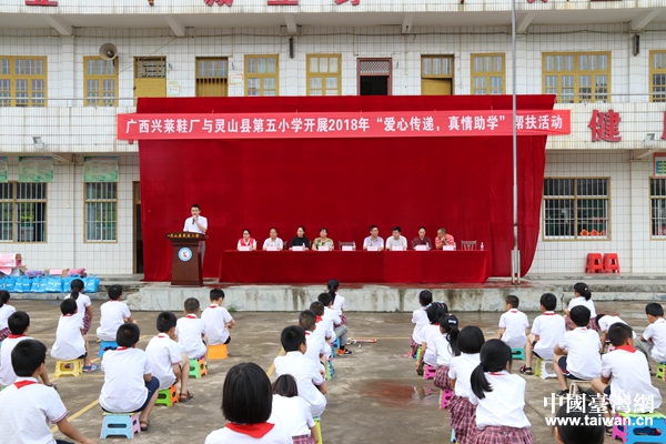 中國臺灣網(wǎng)5月8日靈山訊 5月4日,廣西欽州市靈山縣臺辦、教育局、總工會、婦聯(lián)等部門到靈山縣第五小學(xué)開展“愛心傳遞 真情助學(xué)”慰問活動,臺資企業(yè)廣西興萊鞋業(yè)有限公司積極參與,向?qū)W校捐贈一批電腦等教學(xué)用品,并為35名貧困學(xué)生和留守兒童捐贈了價值8500元的學(xué)習用具和慰問品。