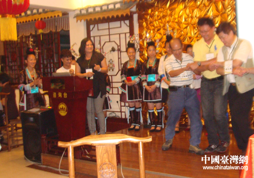 臺(tái)灣客商與榕江縣侗家姑娘進(jìn)行歌舞互動(dòng)表演。(圖片來源:榕江縣臺(tái)辦)