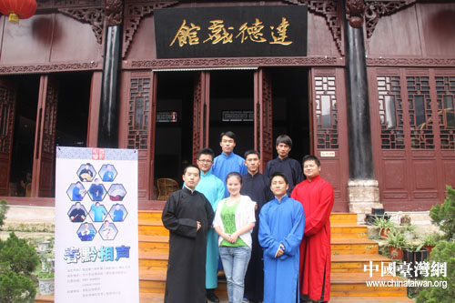 中國臺灣網(wǎng)7月13日貴陽消息 長衫、布鞋、折扇、醒木、手絹、快板,這幾個(gè)關(guān)鍵詞勾勒的,可不是一板一眼站在臺前說相聲的老夫子,而是幾個(gè)“80后”的年輕人——穆伍、洪方舟、陳丹等。每月第一、三周六晚上的8點(diǎn),在貴陽市達(dá)德書院,“春黔相聲工作室”的幾個(gè)80后年輕人會身穿長衫,手拿快板,用夾雜著現(xiàn)代詞匯的“傳統(tǒng)相聲”來博得滿場的喝彩。通過網(wǎng)絡(luò)了解到貴陽有這樣一群熱愛、傳承中華傳統(tǒng)藝術(shù)的年輕人,臺灣東森電視臺《生活接力棒》欄目組便來到這里對他們進(jìn)行采訪,希望向廣大觀眾傳遞一種精神——夢想與堅(jiān)持。