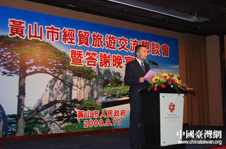 9月10日下午,黃山市在臺北王朝大酒店成功舉辦經貿旅游招商推介會。臺灣雙電公會等30余家商業協會、臺灣春保鎢鋼集團等90家企業,臺灣東森電視臺等10家當地媒體應邀到會。黃山市副市長徐健敏結合赴臺參加“合肥——臺北首航式”之機專程到場為推介會致辭,市長助理劉光、市旅委負責人作了招商、旅游推介,臺灣中華國際觀光協會理事長劉宗明、臺灣春保鎢鋼集團董事長廖萬隆代表臺灣各界發言。中國國民黨黨主席吳伯雄、副主席蔣孝嚴、臺灣“立委”劉盛良等知名人士為本次活動贈送了花籃。