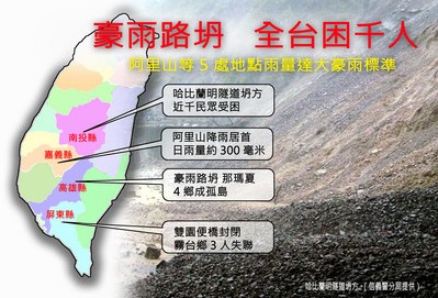 據(jù)臺灣“今日新聞”報道,臺灣梅雨鋒面發(fā)威,一整夜降下大豪雨,讓嘉義縣阿里山區(qū)累積雨量高達308毫米,造成山坡土石松動,大石頭從山頂滾落下來,把兩線道縮成一線道;另外,129線道通往新美、茶山和山美村路段便橋被大水沖毀,1000人受困等待救援。