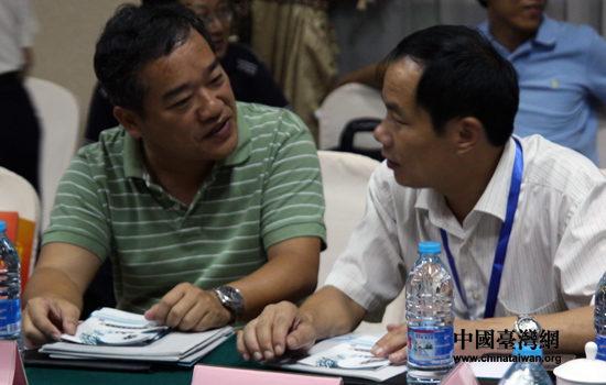 18日晚,第二屆兩岸鄉村座談舉行兩岸結對子鄉村見面會,兩岸30個鄉村代表參加。圖為結成對子的兩岸鄉村代表在交談。(中國臺灣網 張弛 攝)