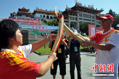 來自兩岸的火炬手在湄洲傳遞福建省第十四屆運動會火炬。 林劍冰 攝