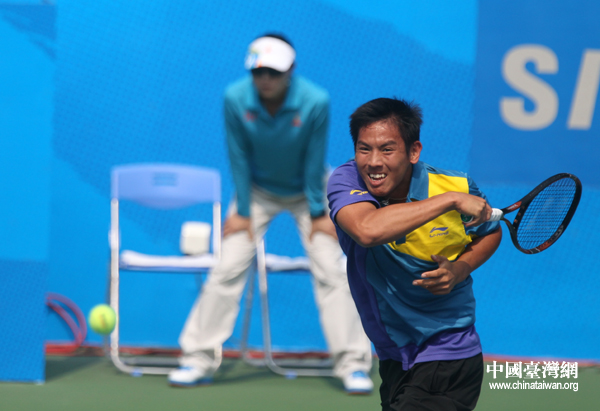 16日,第十六屆廣州亞運會男子網球團體賽決賽正在進行,中華臺北隊與烏茲別克斯坦隊爭奪冠軍。第二場單打由中華臺北隊楊宗樺對烏茲別克斯坦選手陣丹尼斯·伊斯托明。圖為楊宗樺奮力回球。(中國臺灣網 鐘寶華 攝)