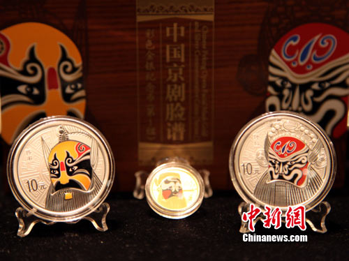 中國(guó)人民銀行發(fā)行的中國(guó)京劇臉譜彩色金銀紀(jì)念幣(第1組),其中金幣1枚,銀幣2枚,新近在臺(tái)灣面市。圖為11月16日,中國(guó)金幣總公司在臺(tái)灣的總經(jīng)銷,位于臺(tái)北市和平東路三段68之1號(hào)的臺(tái)灣大洋金銀幣公司展售的該套金銀紀(jì)念幣。據(jù)悉,由于臺(tái)灣有著不少的京劇票友,該套紀(jì)念幣很受歡迎。